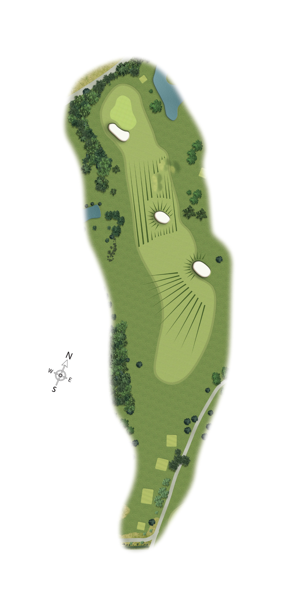 This downhill Par 4 offers a lovely view !rom the tee and is an inviting start to the round. Players that want to attack the green with their second shot should aim their drive towards the right edge of the fairway as this will open up the green for the second shot. The green slopes up ail the way from front to back, so best to stay short of the pin to leave an uphill putt.