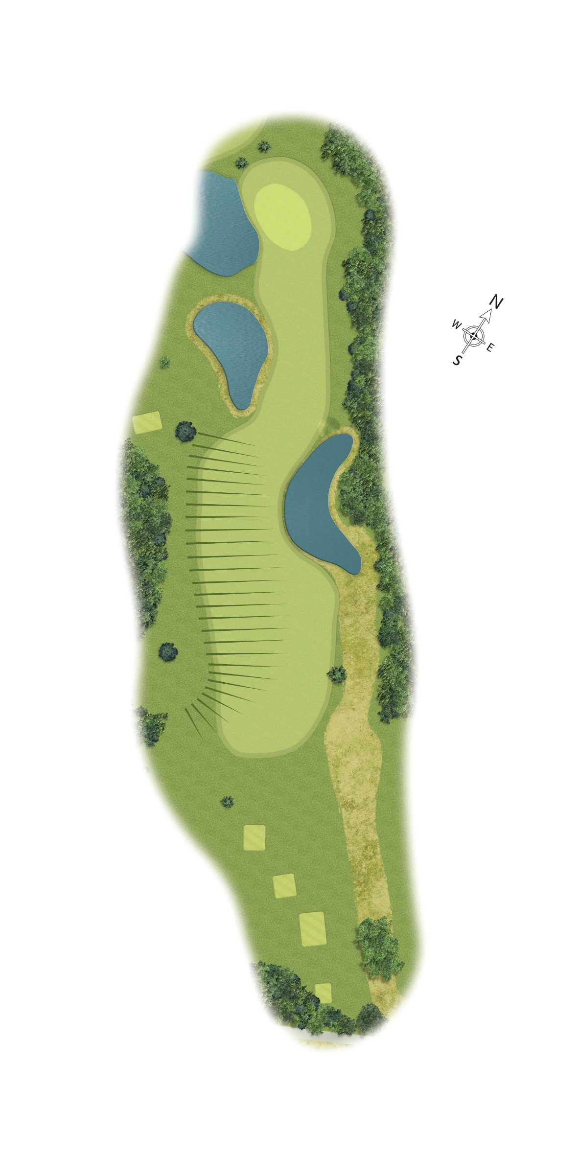 Long-hitters can choose to drive over the lirst pond or towards the second pond which leaves only a short approach shot. The smart play for the bogey golfer is to aim his drive towards the left and then position hîs second shot on the rîght sîde of th fairway. The green is slopîng towards the pond and cornes dang ously close to il, so players should carefully weigh up their optî ns for theîr approach shot.