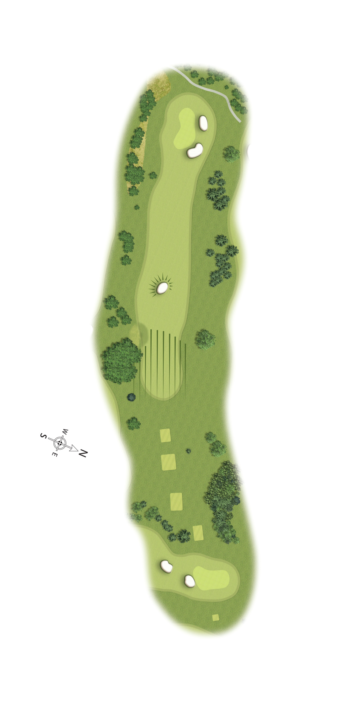 The fairway is wide but well defended by a small central bunker. Long-hitters can try to hit over that bunker, preferably to the left side of the fairway for the best line into the green. The bogey golfer may decide to stay short of the the fairway bunker with his drive and then hit towards the left side of the fairway which will take the greenside bunker out of play for the third shot.