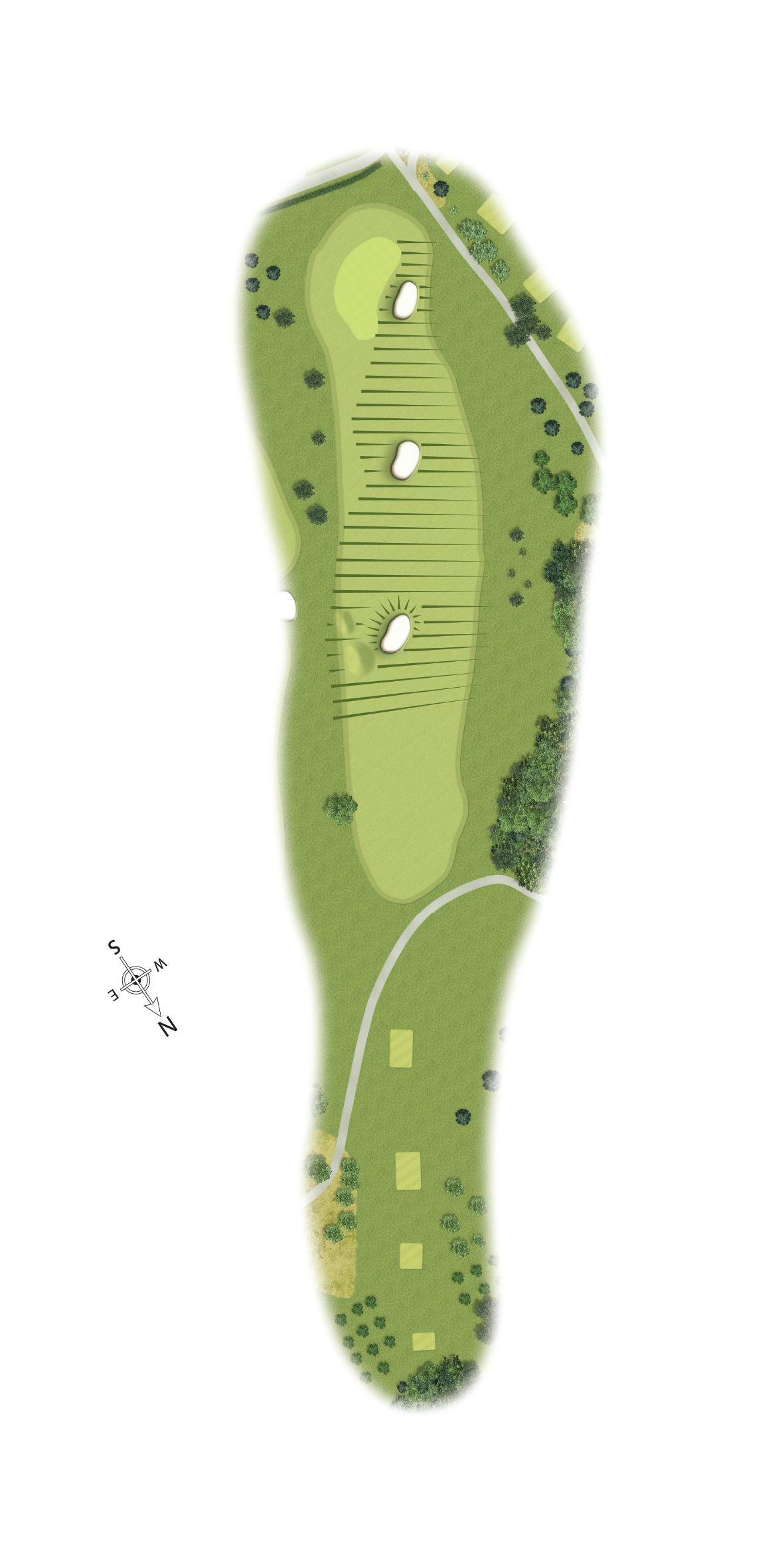 The fairway slopes fro left to right and the green is angled to the playing direction and defended on the right by a deep bunker. The perfect tee shot goes to the left of the first fairway bunker as this position gives the ideal position to a1tack the green. The bogey golfer should try to lay up his second shot on the left side of the fairway in order to give himself a straight forward pitch or chip into the green.