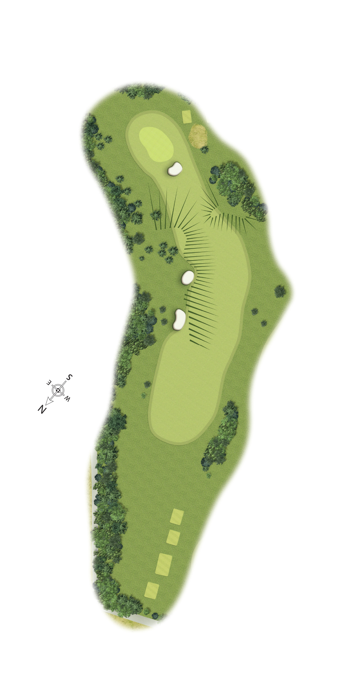 The ideal tee shot is positioned al the centre of the dog-leg corner which offers the player a full view of the entire green complex. The deep bunker in the inside corner of this dog-leg should be avoided at ail costs. The green slopes from left to right, a bunker guards the entrance on the right and there is a depression on the left. As a result, a precise shot into the green is required.