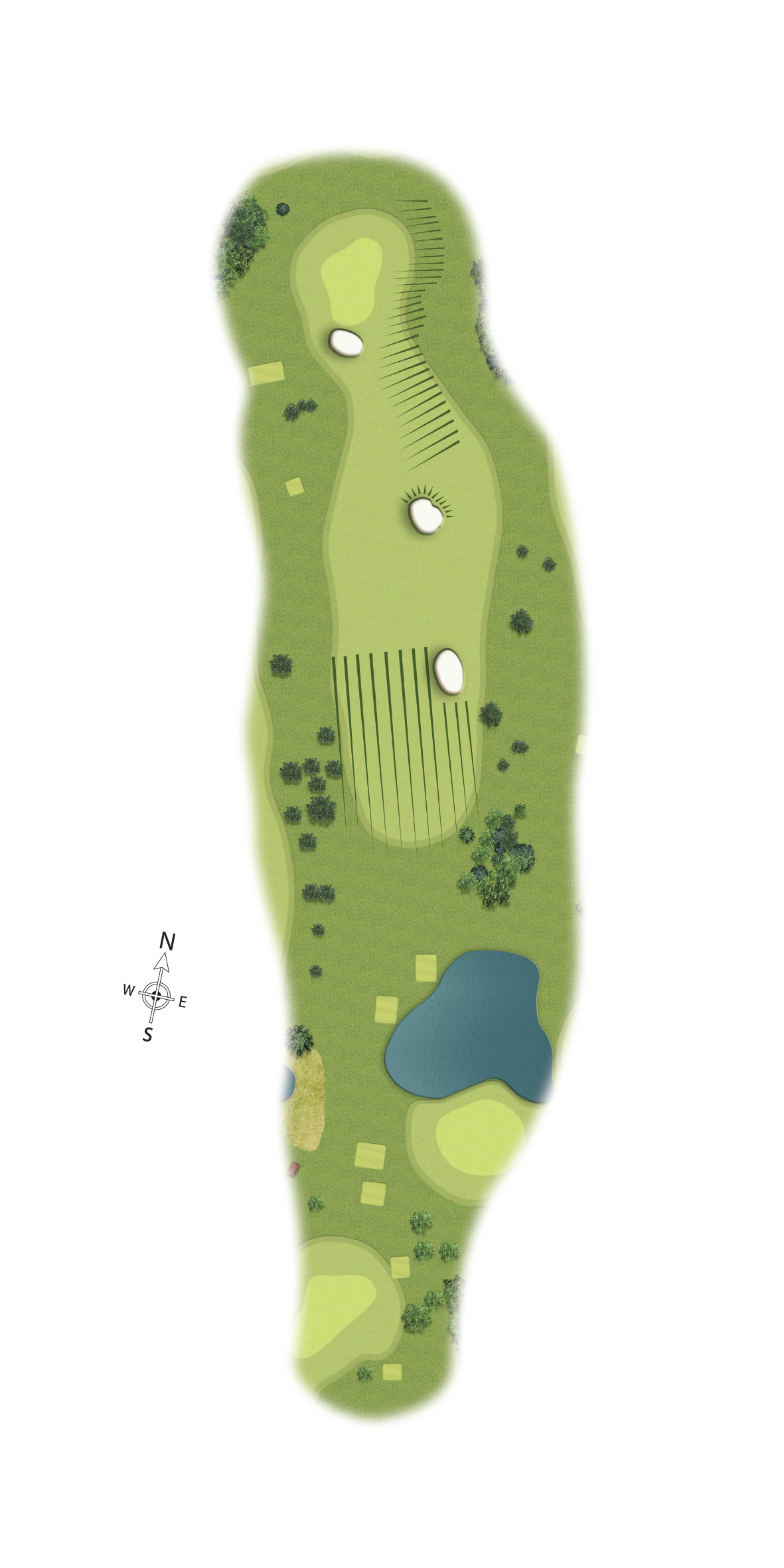 Long-hilters may elect to hit over the right fairway bunker but need to avoid the central bunker 80 meters in front of the green. Bogey players should aim al the wide fairway short and left of the first fairway bunker. Missing the green on the right leaves a fairly easy chip but any shots that are left or long will end up a long way below and away from the green.