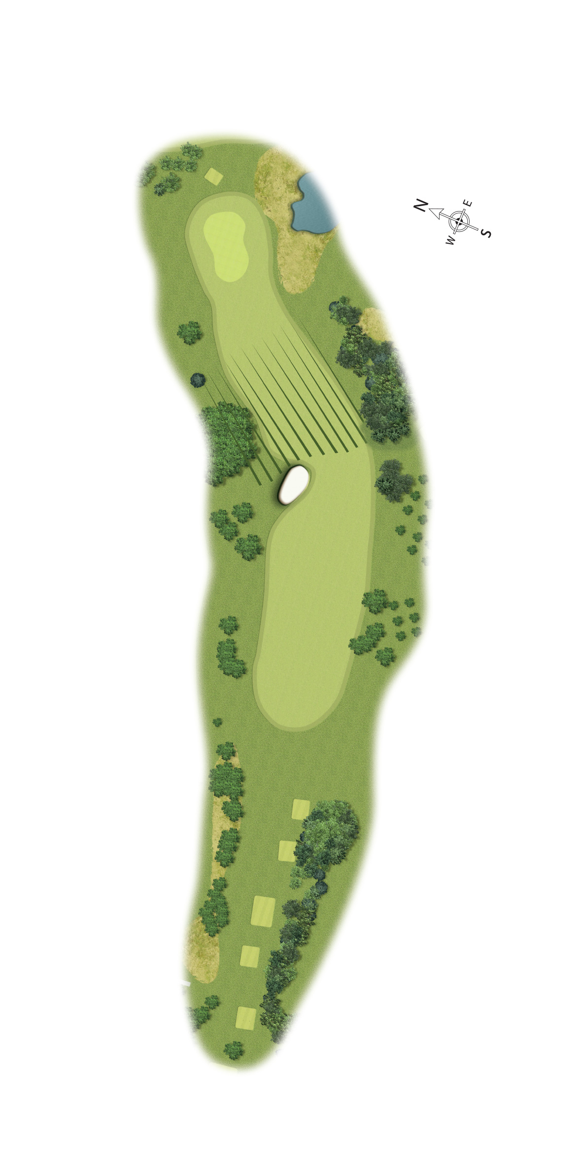 A perfect drive over the fairway bunker will let the downslope feed the ball towards the green. Bogey players may take advantage of the downslope of the second part of the fairway for their second shot. The green is long but fairly narrow and any shot that is slightly off line will end up in one of the hollows that are guarding this green on ail sides.